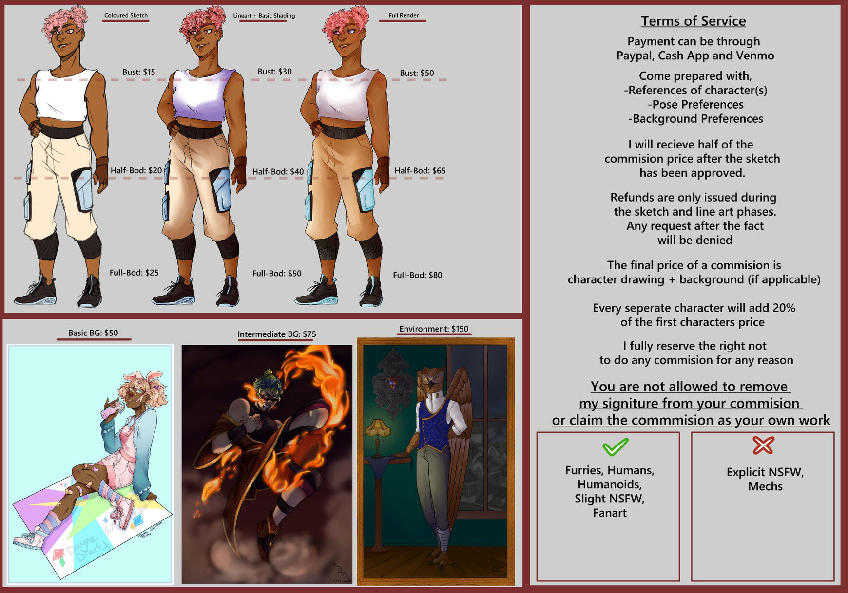 You've arrived at my commissions page. Here you'll find info on what I offer, examples of my work, ways to contact me and payment information!